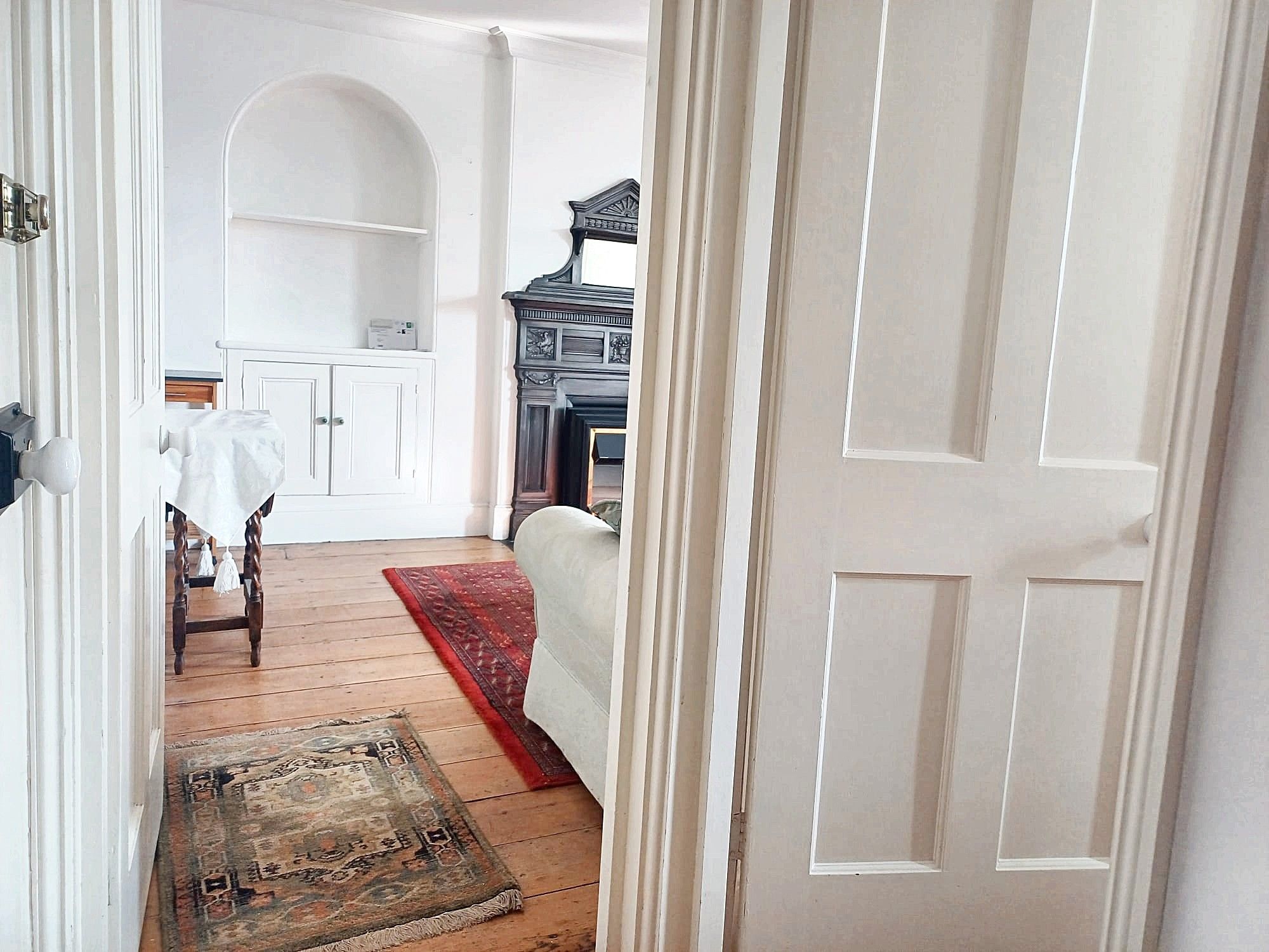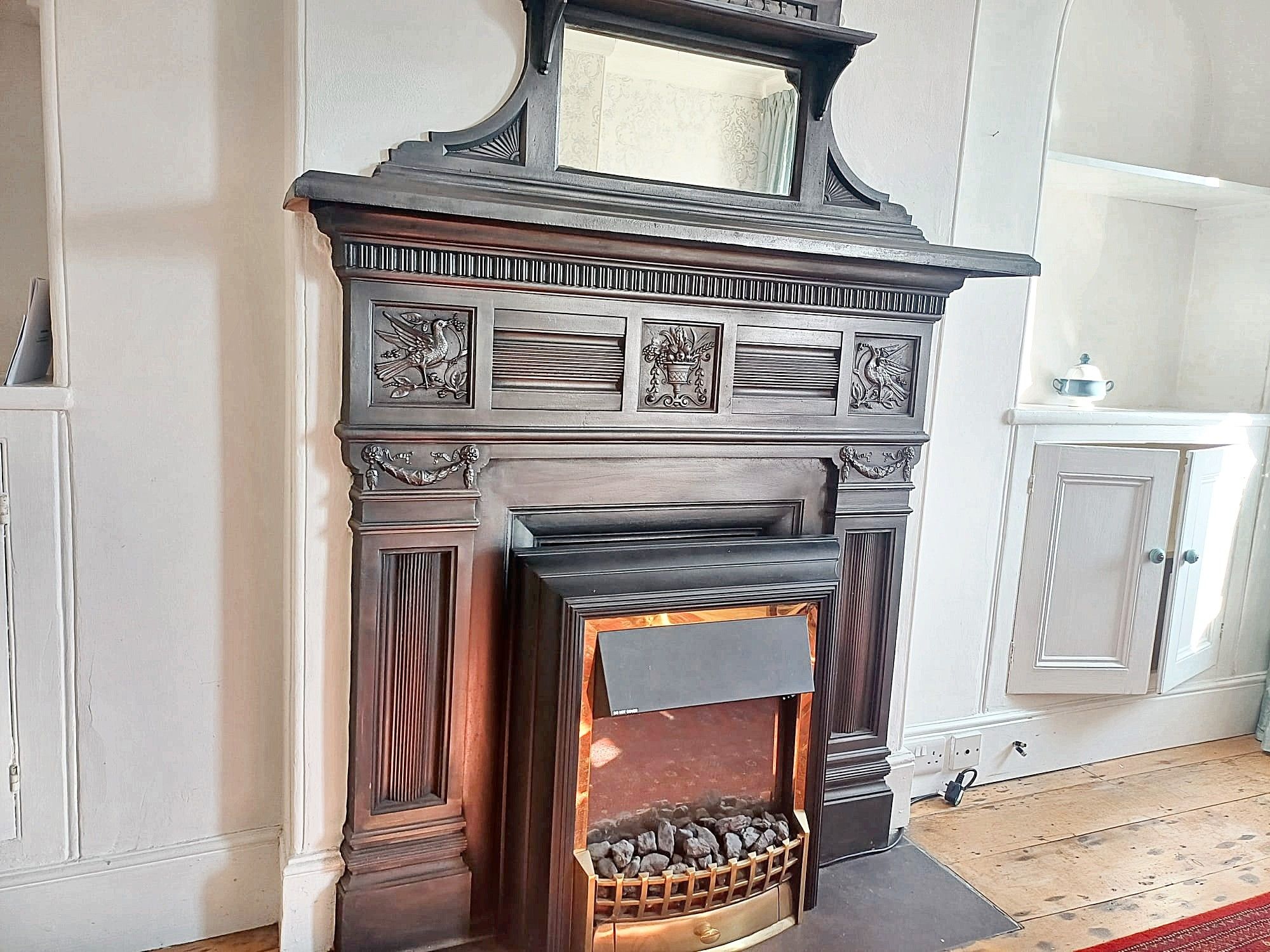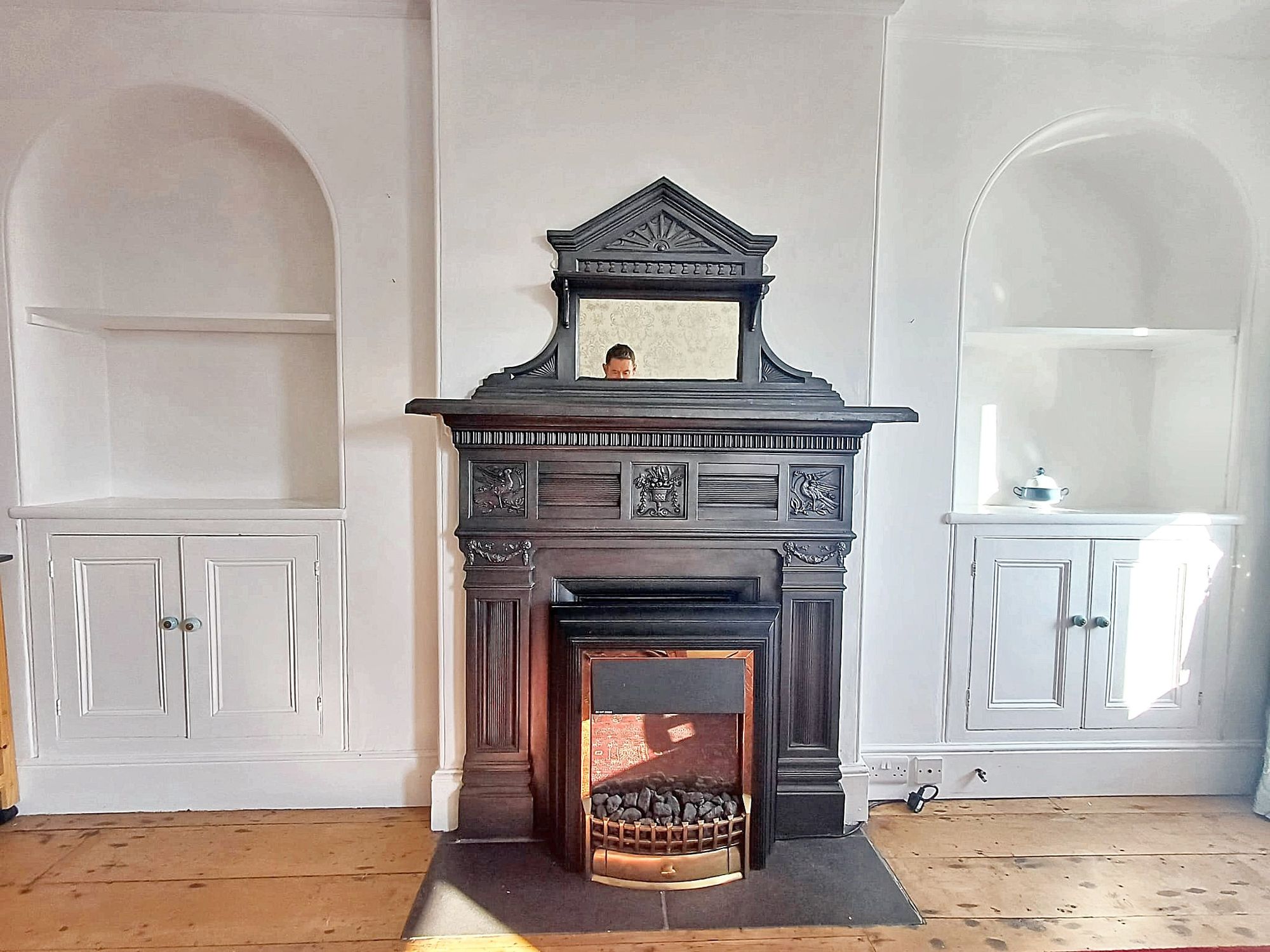 Twin double glazed sash windows with views to countryside. Two arched alcove recesses with shelving and storage cupboard. Decorative cast iron fireplace. Electric programmable heater. Original floorboards. Views across to Shaldon