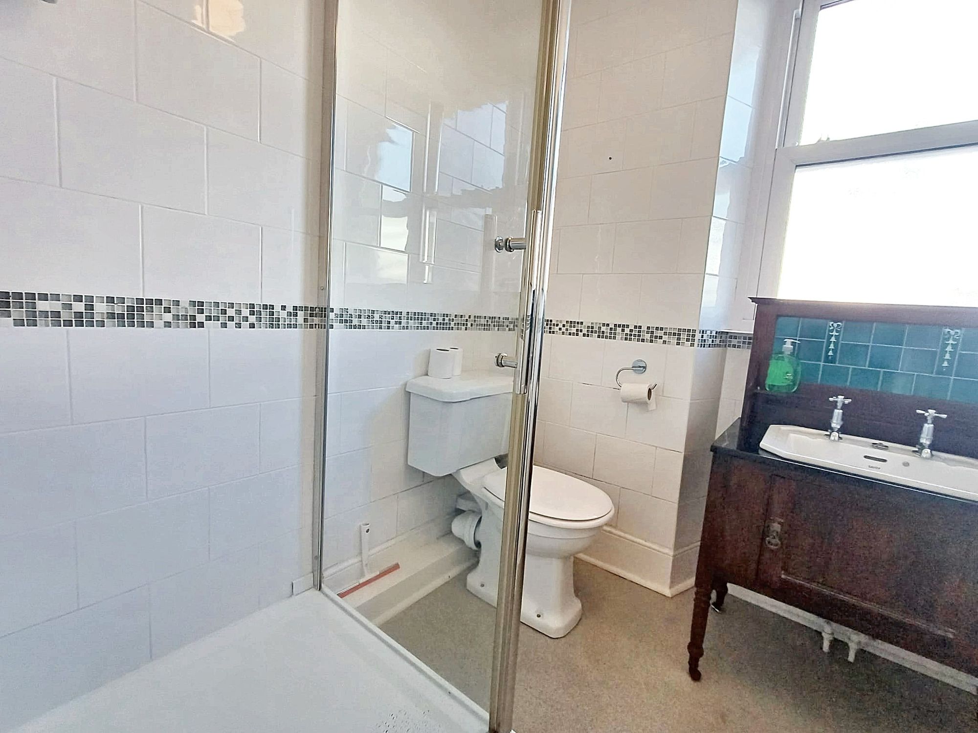 Glazed shower cubicle with plumbed shower. WC. Wooden Victorian style vanity basin with granite top and tiled splash back. Tiling to walls.