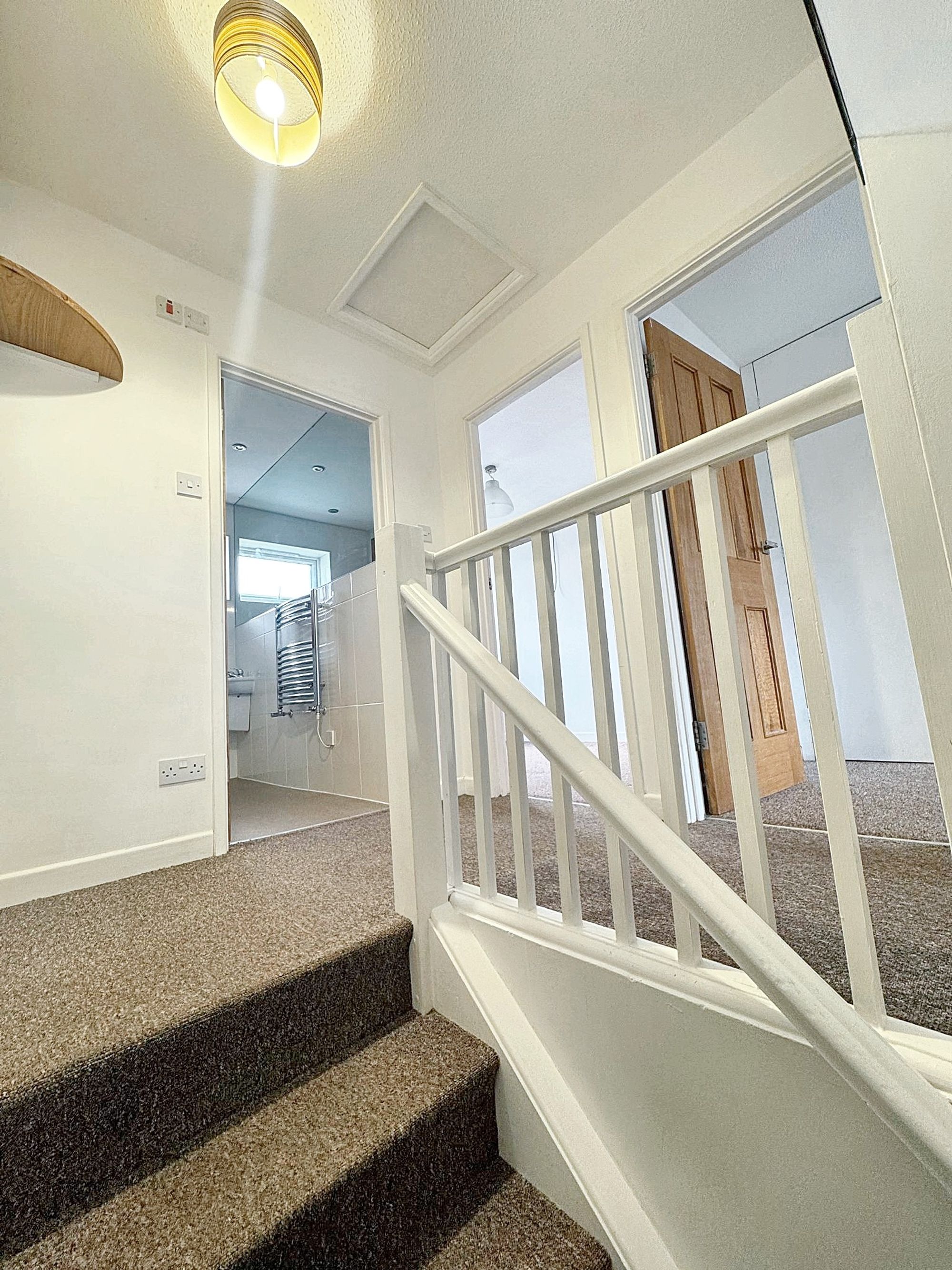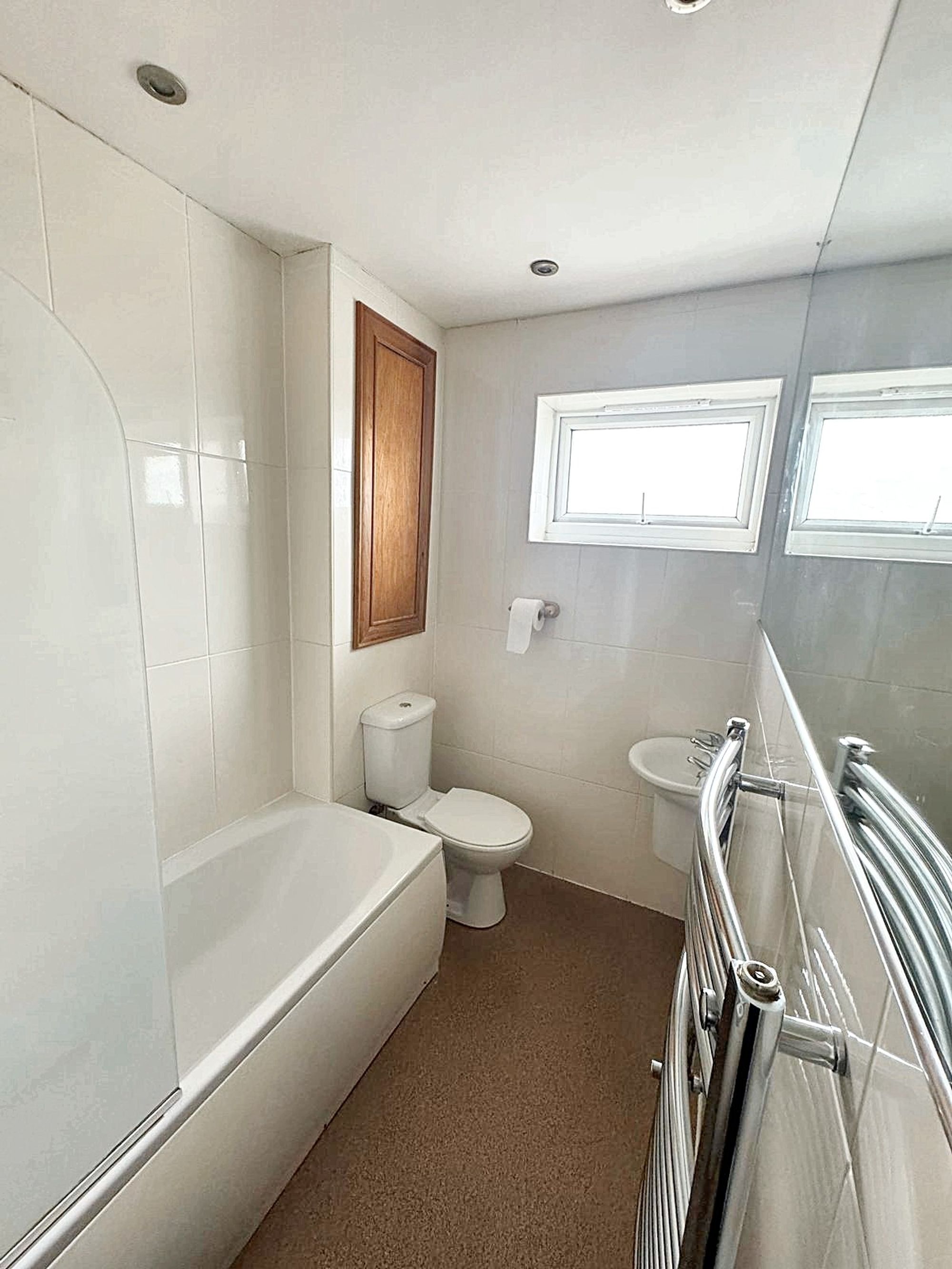 he bathroom with its electric shower and mixer shower attachment over the bath, complemented by a recessed storage cupboard — perfect for keeping essentials tidy.