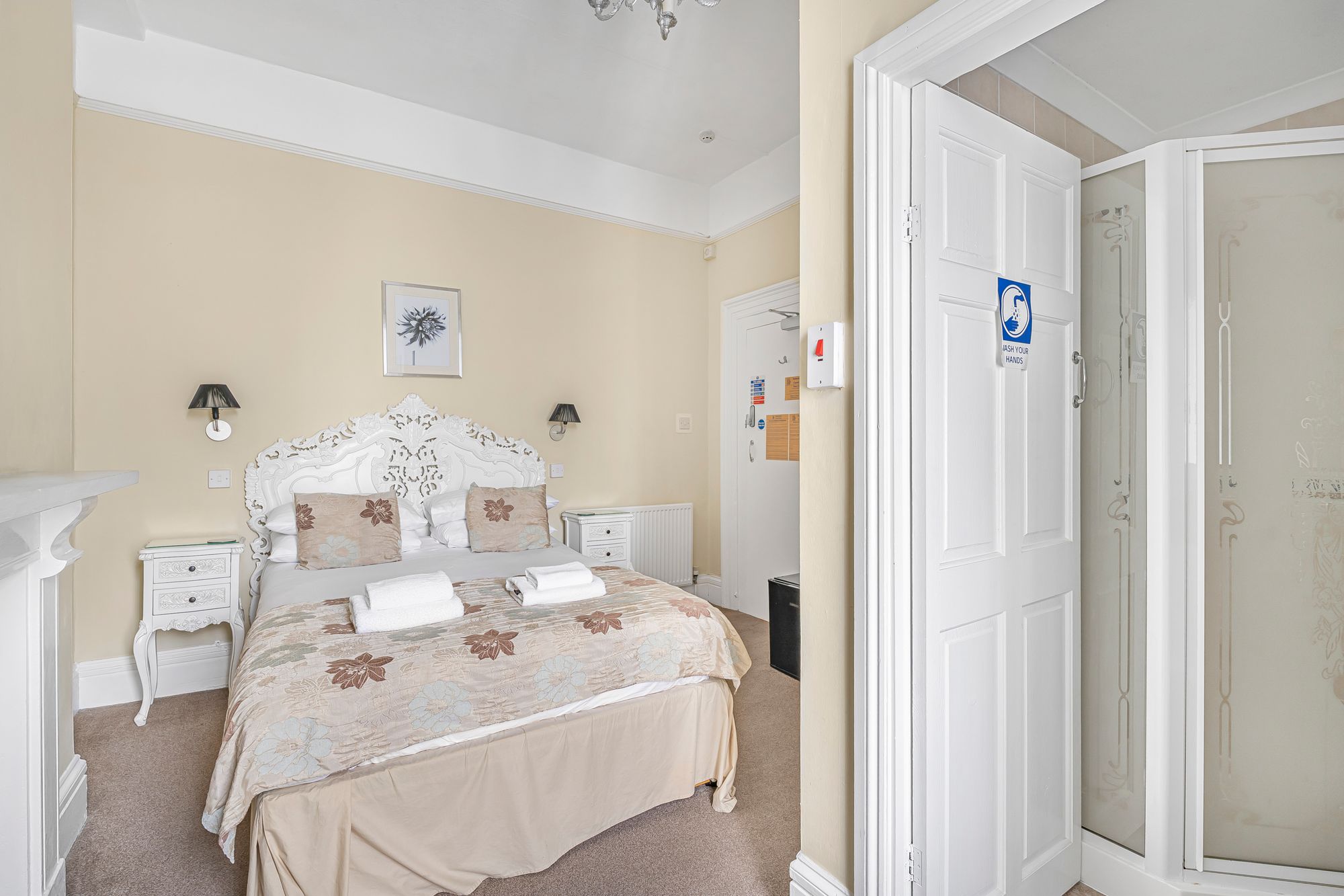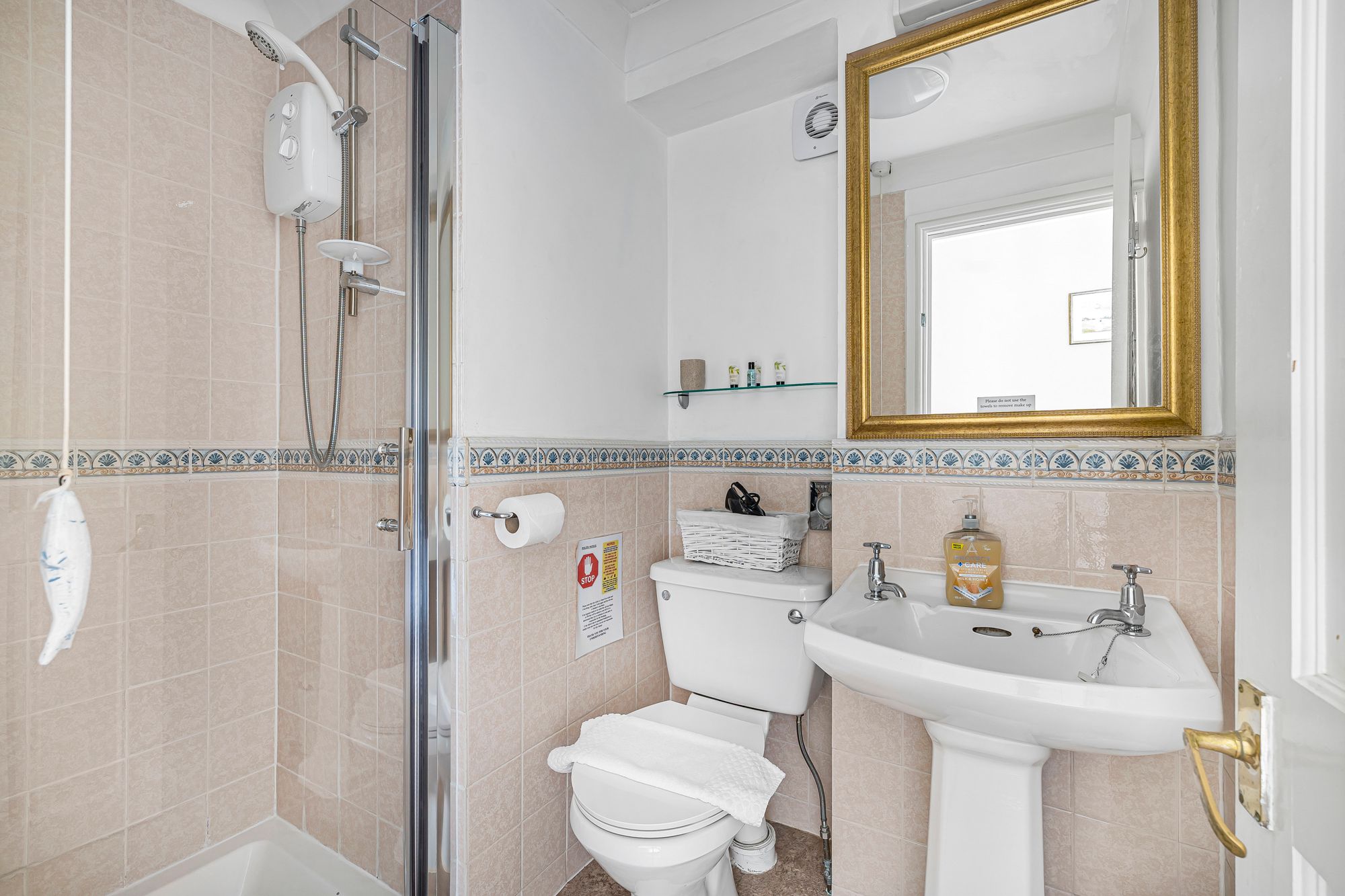 BEDROOM This is a small double room featuring an en-suite with a shower, low-level WC, and wash hand basin. The bedroom has a window to the front of the property.