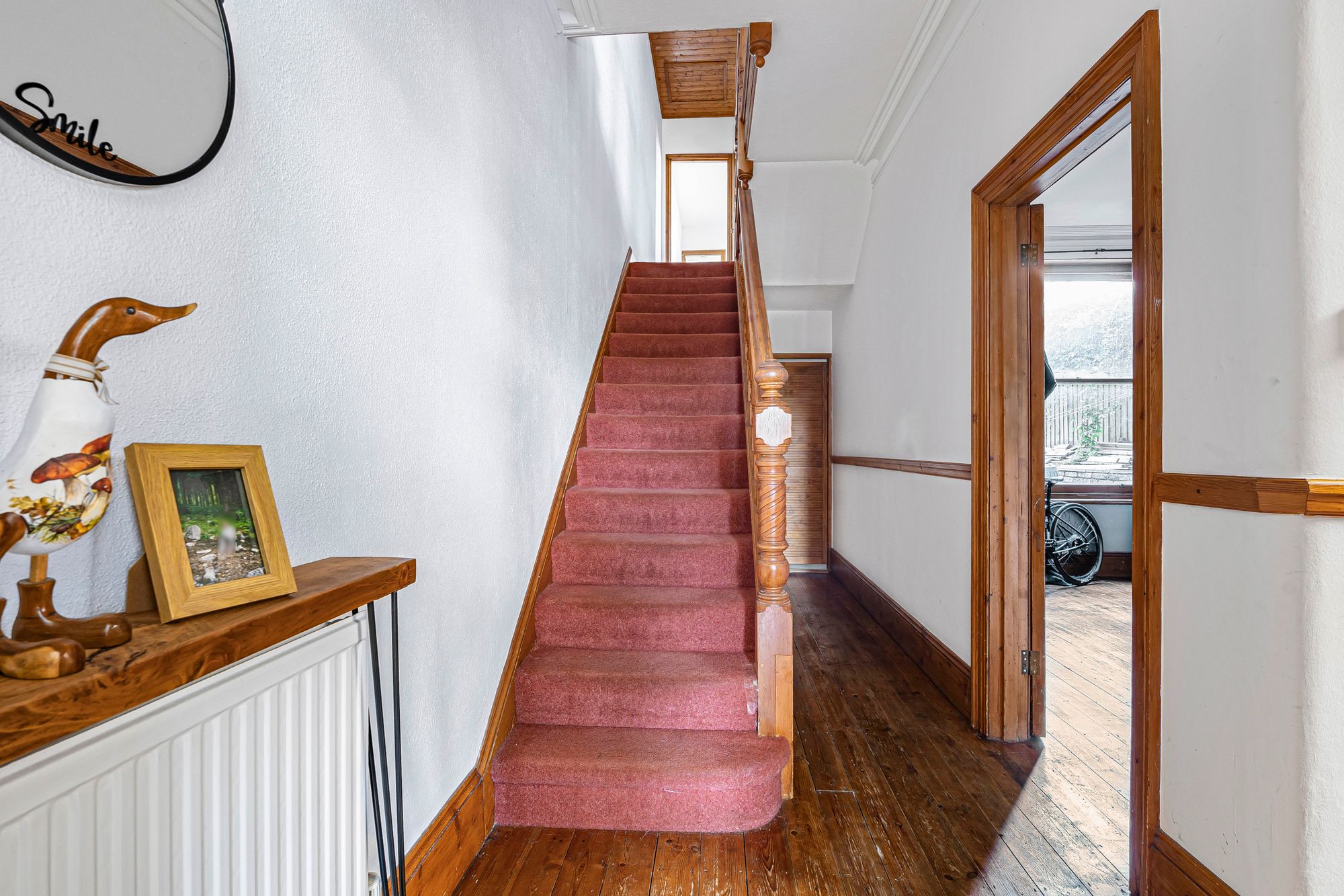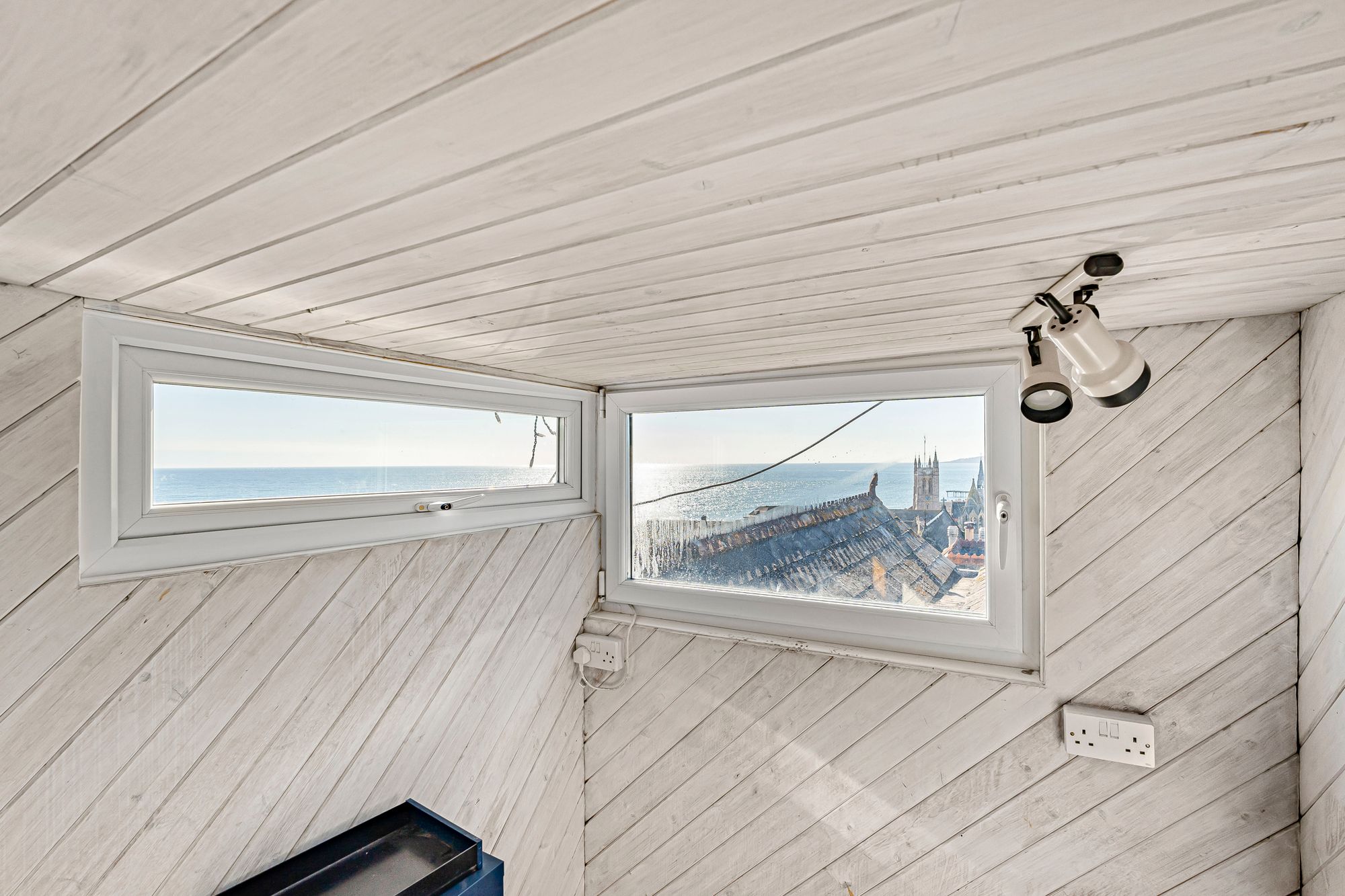 The outdoor areas are equally impressive, featuring a private, low-maintenance garden with artificial grass, a paved patio ideal for al fresco dining, and a balcony that offers sweeping views over the garden and out to sea. Multiple reception rooms provide flexibility for formal entertaining, family living, or creative spaces, with cosy features like a wood burning stove anchoring inviting gathering spots. Additional highlights include a welcoming front garden, practical built-in storage throughout, and proximity to both natural beauty and historic architectural landmarks. This is a rare opportunity to acquire a distinctive period home with a perfect balance of modern comfort, timeless charm, and awe-inspiring vistas.