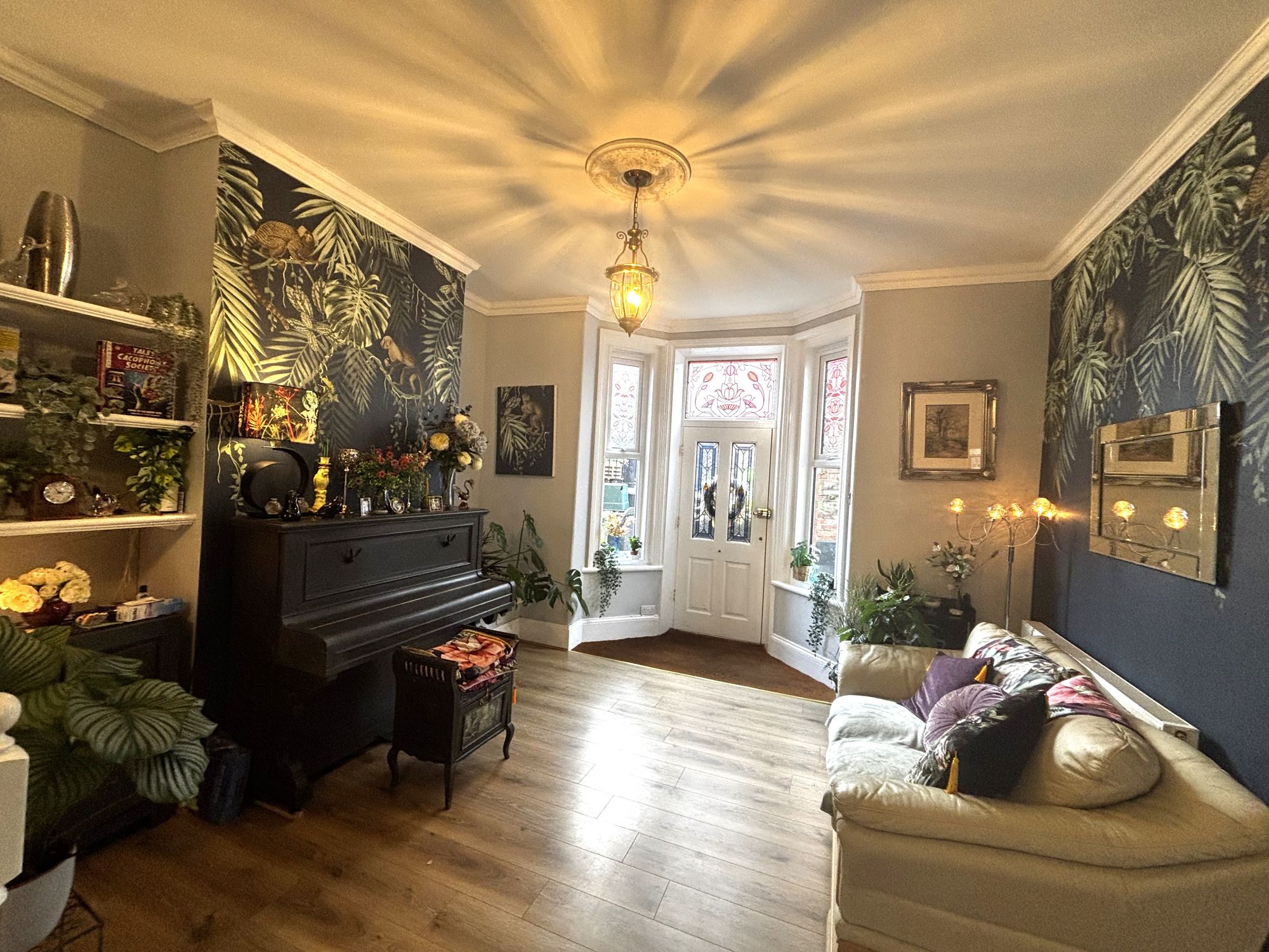 A fabulous entrance foyer being spacious with high ceilings. Double glazed stained glass effect windows and door to front. Stairs to upper and lower floors. Shelving and cupboard to 1 side of chimney breast. Spacious Storage cupboard, radiators. Doors to: