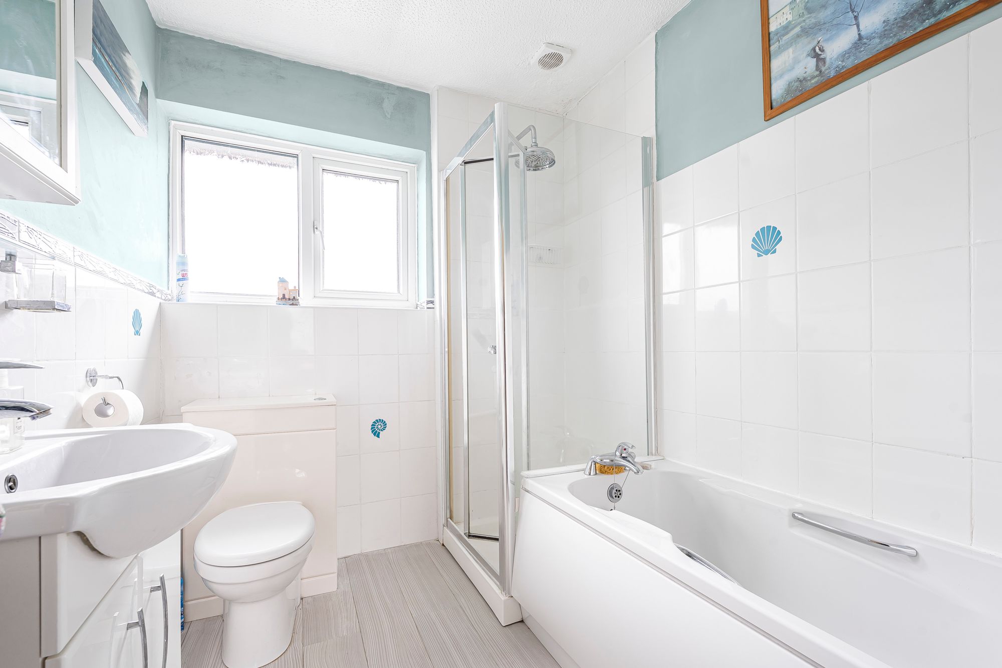 Fitted with a modern matching 4 piece white suite comprising of: Panelled bath, shower cubicle with mains shower, low level WC and wash hand basin with mixer tap set into vanity unit with cupboard below. Double glazed window, chromed ladder style radiator. Access hatch to loft space.