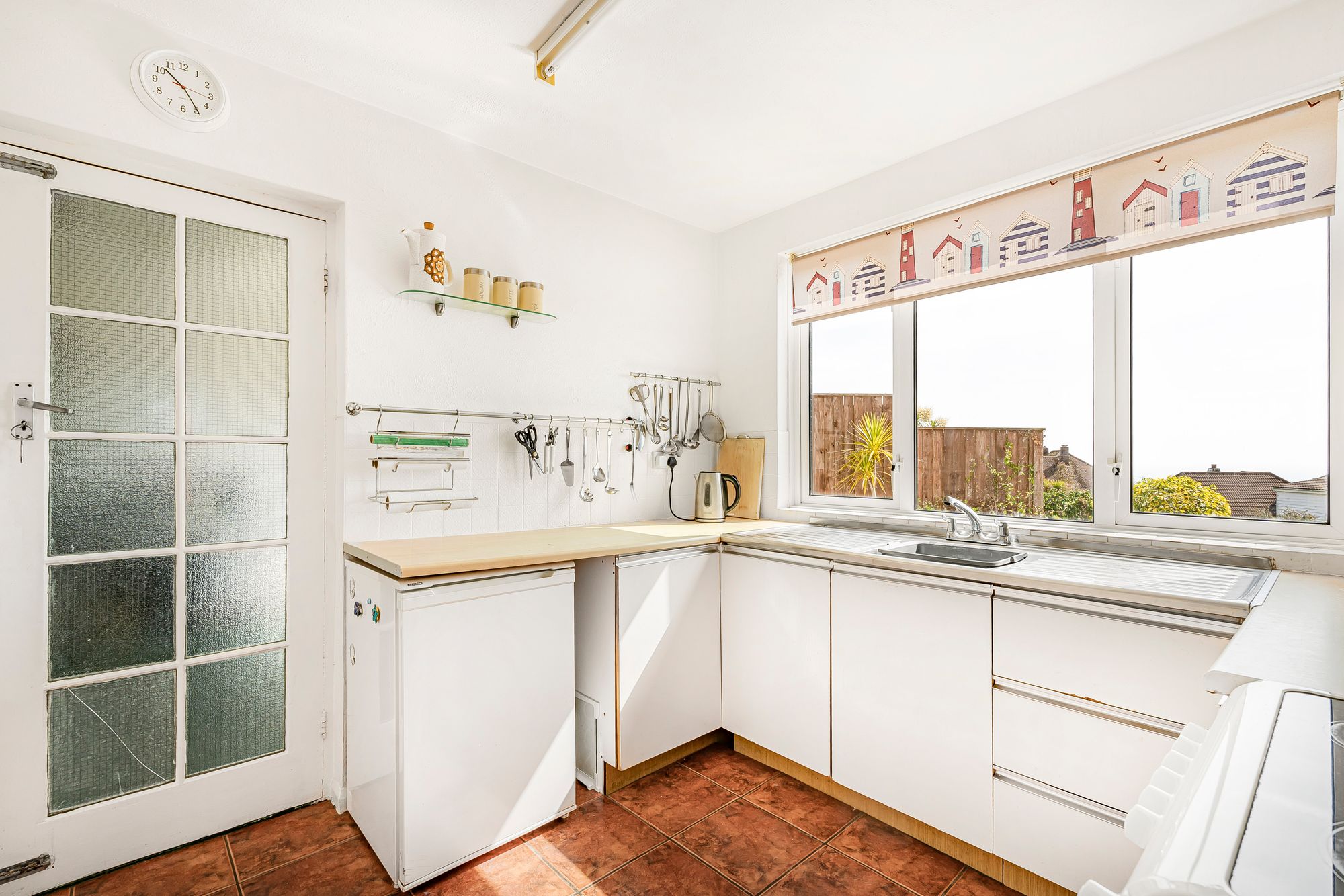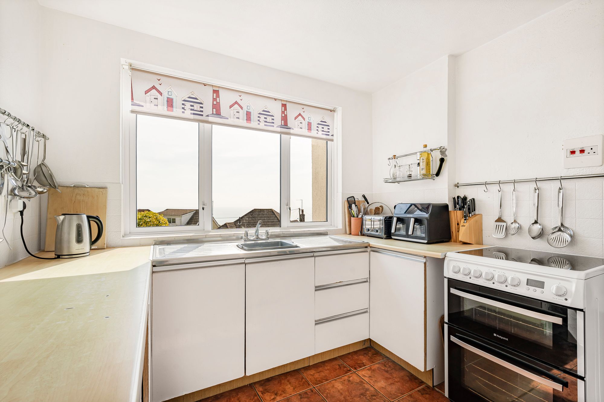Fitted with a matching range of base mounted units and drawers with roll edge work surface over. Single bowl double drainer stainless steel sink unit with mixer tap. Fitted electric cooker and space for fridge. Larder cupboard with shelving, radiator and double glazed window to rear enjoying superb sea views. Connecting door to garage/utility.