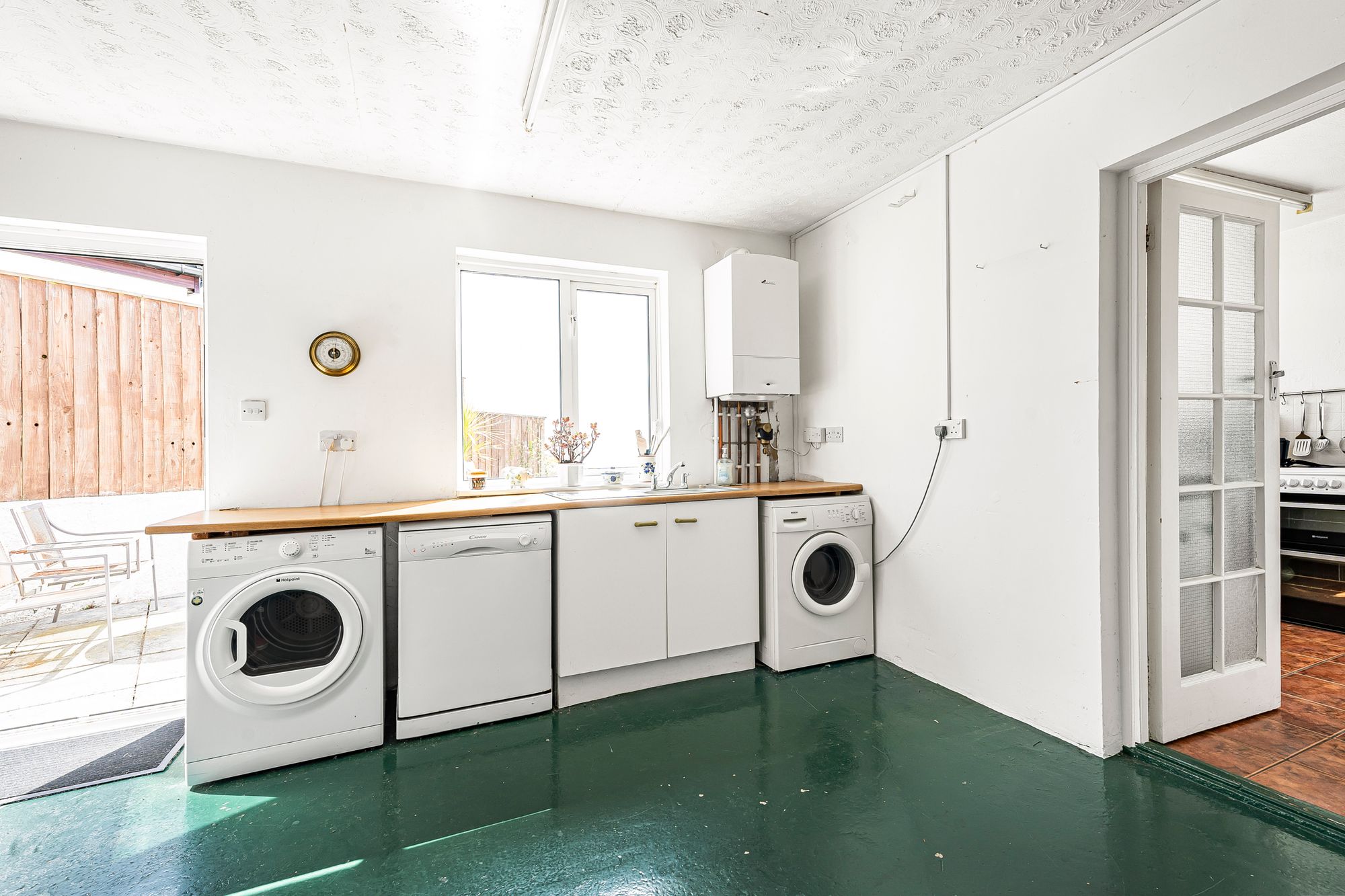 A larger than average garage which is wedge shaped. Up and over door. Utility area at rear with roll edge worksurface and cupboards, inset stainless steel sink unit with mixer tap. Spaces for washing machine, tumble dryer and further appliances. Power and lighting, double glazed window and door to rear enjoying superb sea views.